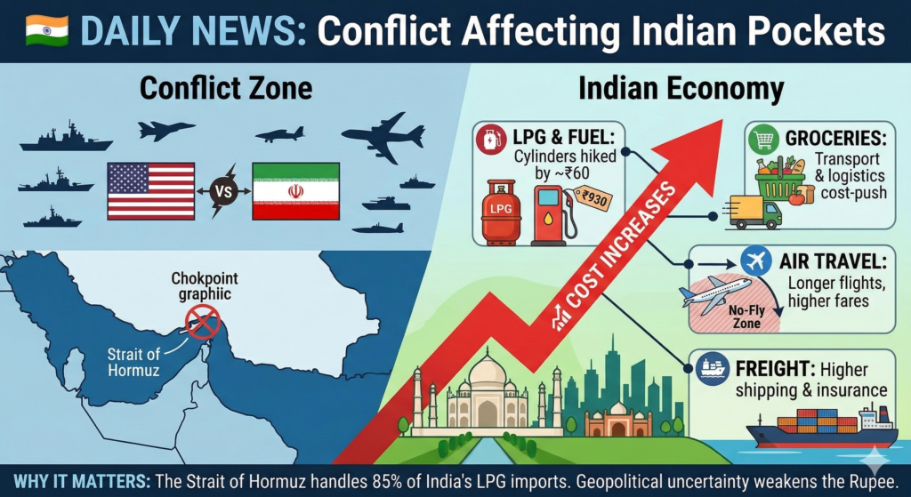 • Supply Concerns: The Strait of Hormuz, currently a focal point of the conflict, handles nearly half of IndiaтАЩs crude oil and LPG imports. While the government assures that there are sufficient fuel stocks for about 50 days, prolonged disruption could lead to further price hikes for petrol and diesel.